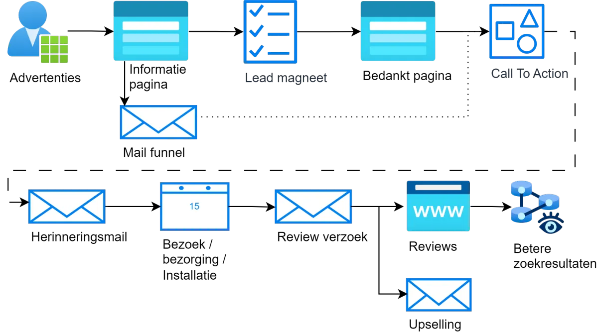 Een funnel werkt alleen als je er brandstof instopt. Binnen Meta en Google is het mogelijk om heel gericht je doelgroep te bereiken, omdat potentiële klanten via advertenties of e-mail op de landingspagina terechtkomen. Op deze pagina raakt een klant meer vertrouwd met jouw product.